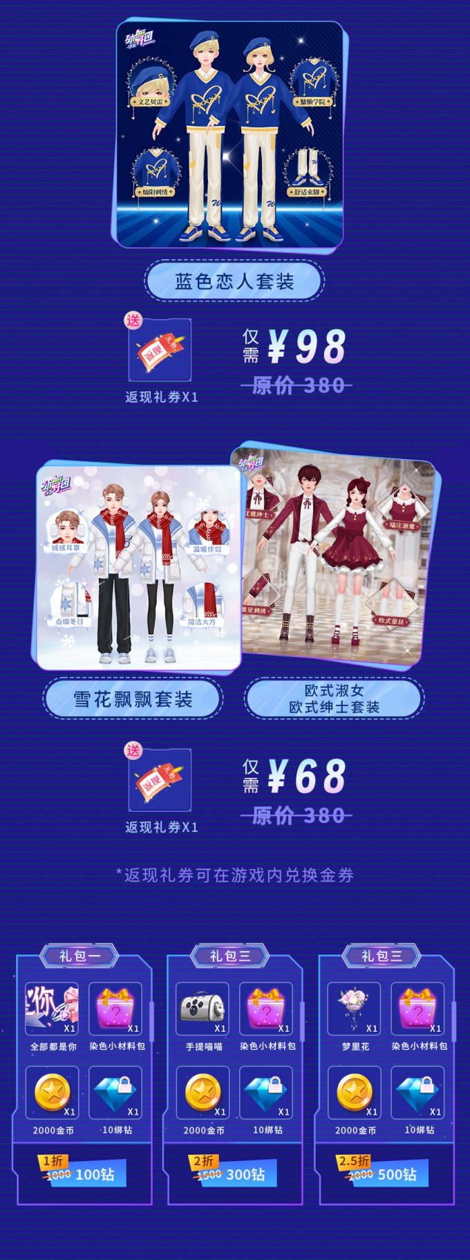 钱包友好,精美服饰向你走来!还在因为错过往期美丽套装难过吗,不用担心!超值回归礼包、超低价格礼包同步上架,最低折扣低至一折,限时享受超值优惠,美丽服饰带回家!