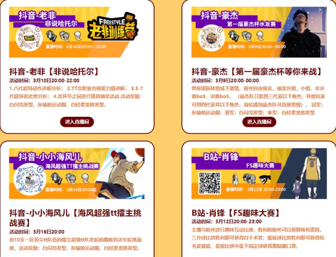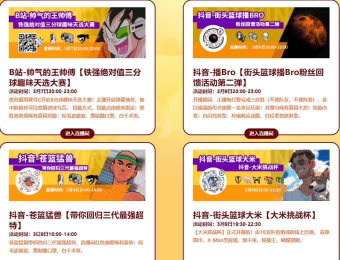 主播与粉丝进行趣味互动比赛,胜利的粉丝可以获取稀有道具。三分球比拼胜利即可获得白千术发;篮板球比拼胜利即可获得棕毛皮披肩,盖帽比拼中盖下指定球获得黑骷髅口罩。